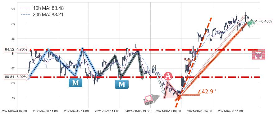 ♞ 10小时均线:88.48,20小时均线:88.21→ 快线>慢线
