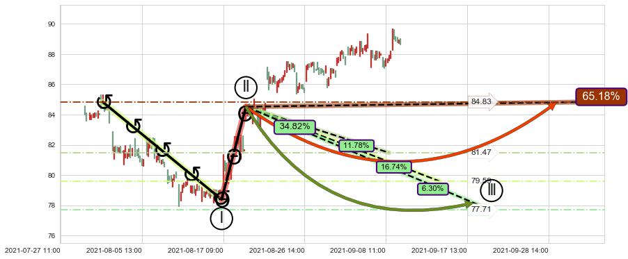 ➢ 循环浪继续向下【最低】位置(09-21:13, 77.71),匹配聚类样本比例18.08%, 可能性概率6.30%