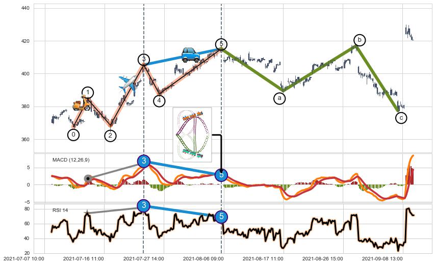 ➣ 突破缺口形成后,后续k已经超过14根,跳空突破波浪理论(5浪)关键点后, 出现【轻微回踩】迹象,短期高点影线回补缺口第二根k线高点
