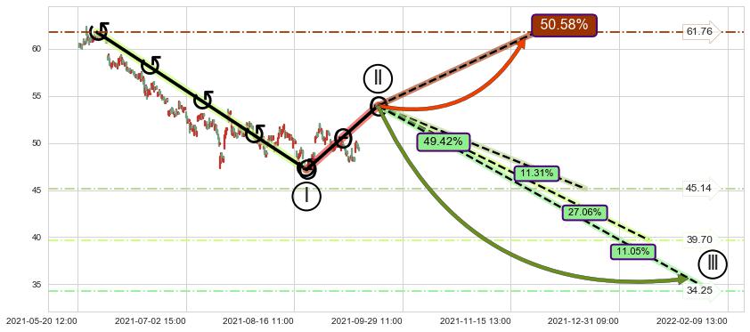 ➣ D点拟合预测价格56.29,距离最后交易收盘价格49.21相差 +14.39%