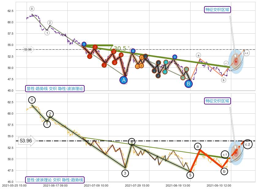 从2021-07-12 13:00至2021-07-21 11:00,共包含48个小时,阶段股价上涨0.46%,阶段股价变动位移路程比: 1 : 68