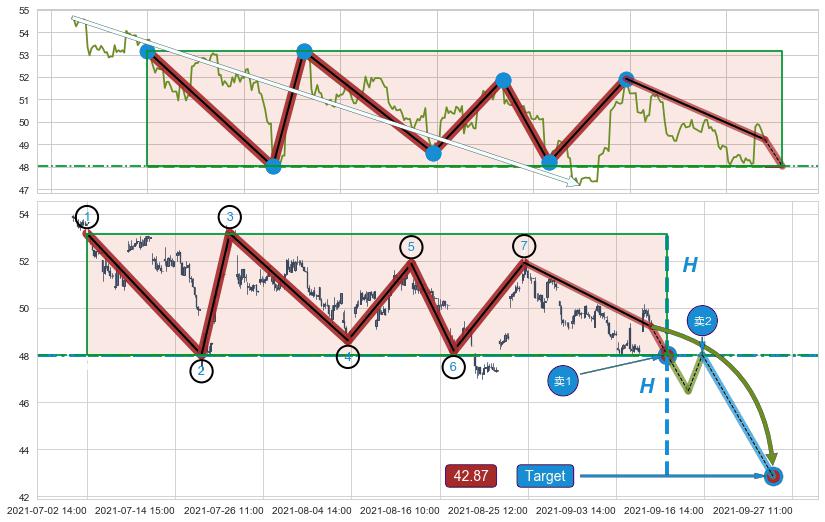 ➣ 最小中继整理跌幅→𝐇: 6.80 (下侧直角边第一支撑点②与斜边垂直距离)