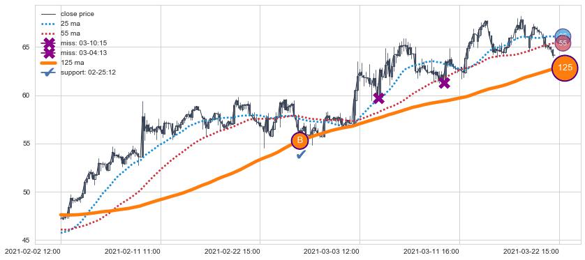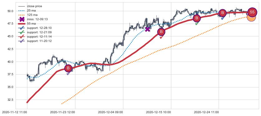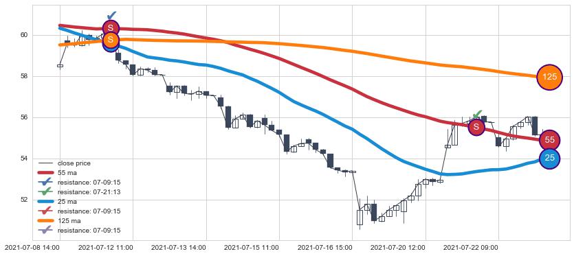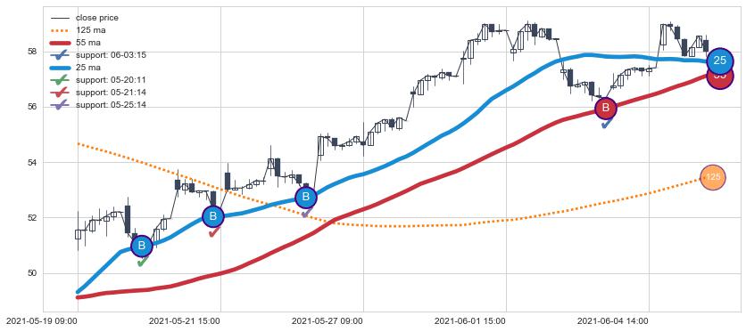 ➢ 最优均线组合共正确确认支撑阻力信号13处,正确确认率 68.42%