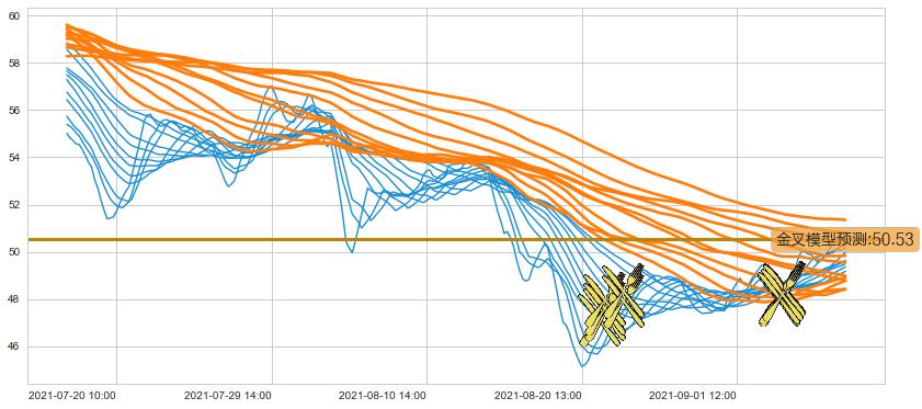 ➣ 60小时均线于(09-03 14:00: 48.35)形成【金叉】基于【金叉历史模型】预测金叉后最高波峰价格: 50.73, 金叉后最高价格50.85,虽然已经到达预测最高波峰价格,但耗时间很短动能很强, 预期继续上涨