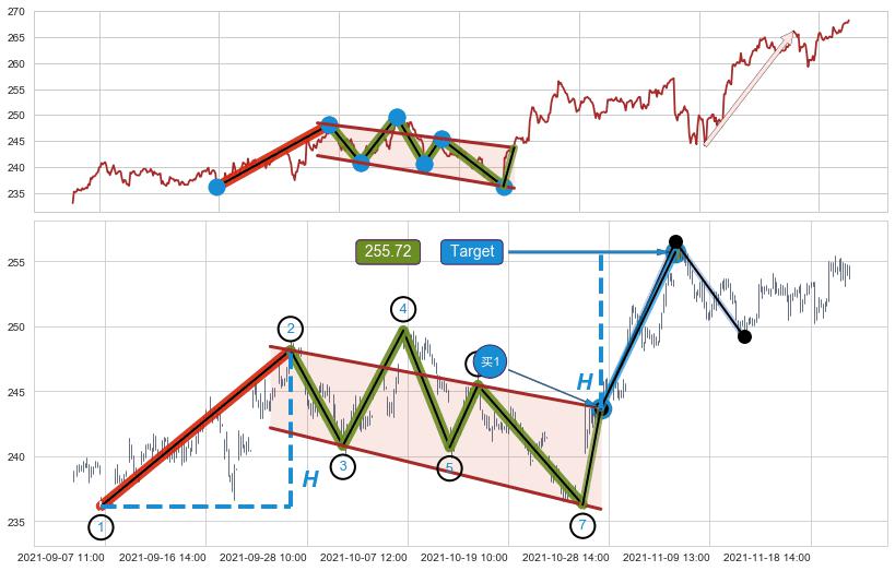 从2021-10-28 12:00至2021-11-23 15:00,共包含125个小时,阶段股价上涨4.02%,阶段股价变动位移路程比: 1 : 7