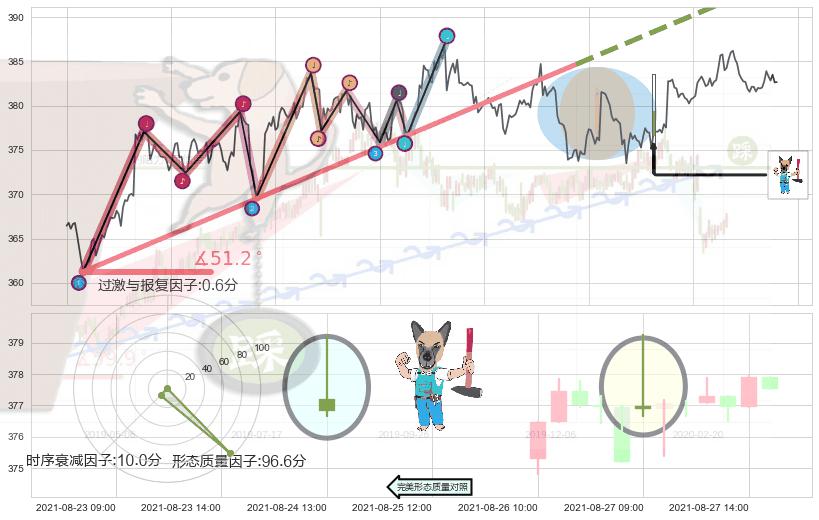 从2021-06-30 12:00至2021-08-19 11:00,共包含237个小时,阶段股价上涨3.89%,阶段股价变动位移路程比: 1 : 14,上涨趋势角度: 51.2