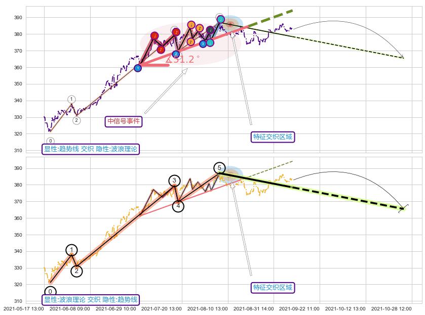 ➢ 2021-06-30 12:00-2021-08-19 11:00上升趋势存在反转[风险],其原上升趋势的支撑位(394.19)已破位[强阻力信号],原上升趋势角度: 51.2˚