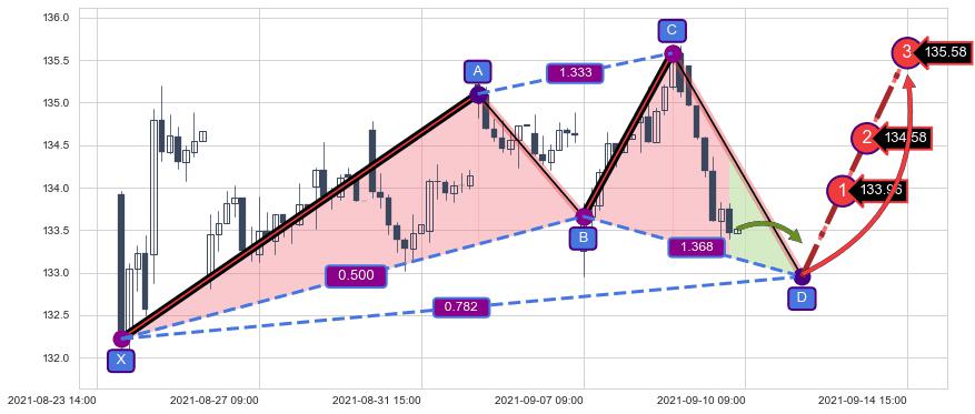 ➢ 谐波蝴蝶:已到达d点:猜想c拉升到达d点后泄力性下沉下跌(均值回复)