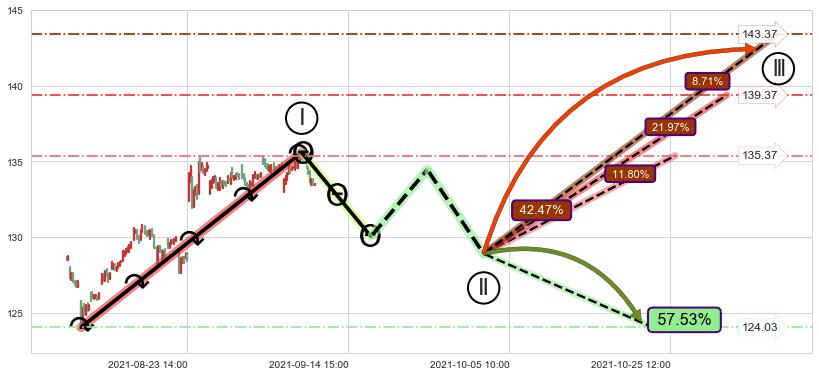 ➣ D点拟合预测价格132.95,距离最后交易收盘价格133.51相差 -0.42%