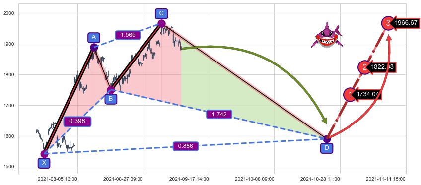 ➣ 谐波鲨鱼:b持续蓄力上拉击穿越过c:猜想泄力性下沉 → 下跌 →【拐点】强阻力临近 → 大趋势均值回复