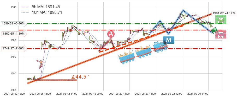 ♞ 5小时均线:1891.45,10小时均线:1898.71→ 快线<慢线