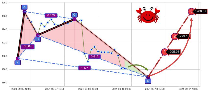 ➣ 谐波螃蟹:c下跌临近d:猜想拉升 → 上涨 →【拐点】强支撑临近 → 大趋势均值回复