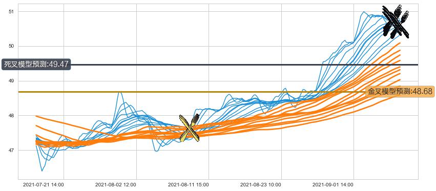 ➢ 70小时均线于(08-09 15:00: 47.66)形成【金叉】基于【金叉历史模型】预测金叉后最高波峰价格: 48.67, 金叉后最高价格51.09,已经上涨超出预测最高波峰价格, 预期回调