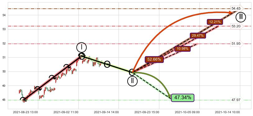 ➢ 循环浪继续向上【最高】位置(10-14:10, 54.45),匹配聚类样本比例23.19%, 可能性概率12.21%
