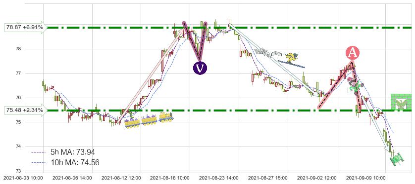 ♘ 阻力价格位75.48,可信任强度77.78%,距离最后交易2021-09-09 14:00形成的收盘价格73.77相差 +2.31%