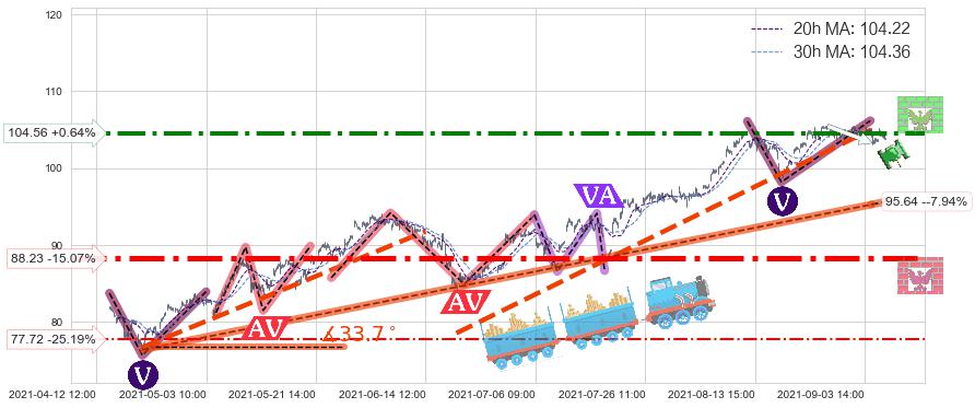 ♘ 在最后的上升阶段2021-04-20 13:00至2021-09-07 14:00存在 持续未破位的支撑位 ,支撑价格95.64,支撑可信任强度86.55%,其距离最后价格103.89相差 -7.94%