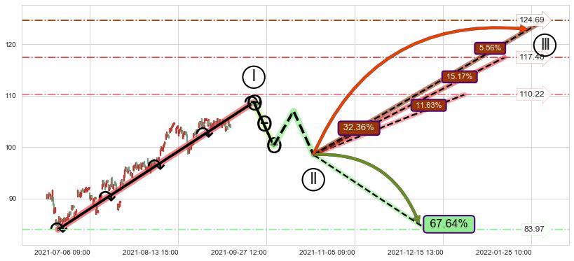 ➢ 高概率大级别循环上涨浪被破坏,反转向下(突破5浪起点)概率67.64%