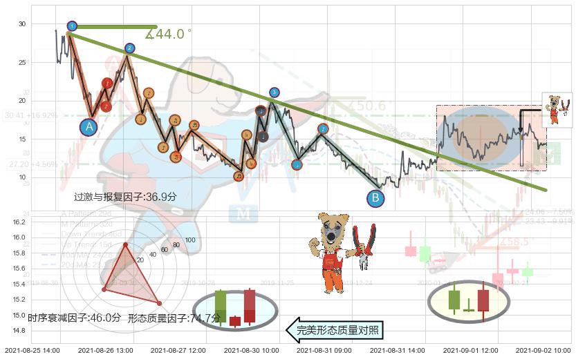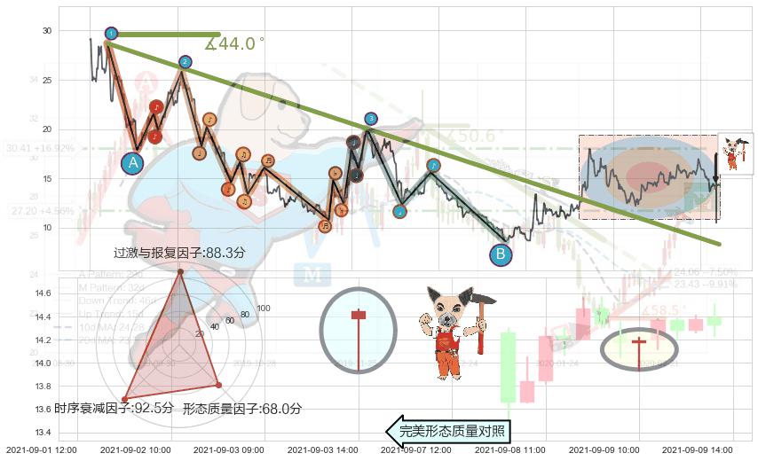 从2021-08-30 12:00至2021-09-09 14:00,共包含48个小时,阶段股价下跌-12.34%,阶段股价变动位移路程比: 1 : 5
