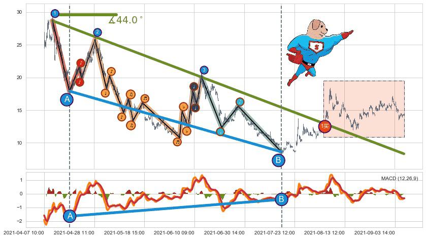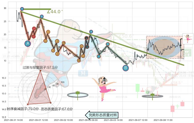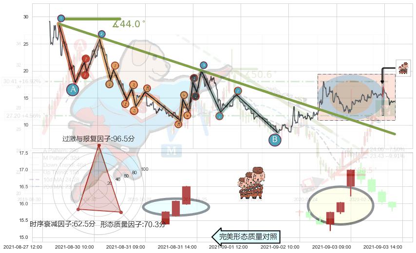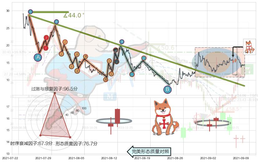 从2021-04-12 09:00至2021-07-26 14:00,共包含492个小时,阶段股价下跌-48.55%,阶段股价变动位移路程比: 1 : 21,下跌趋势角度: 44.0