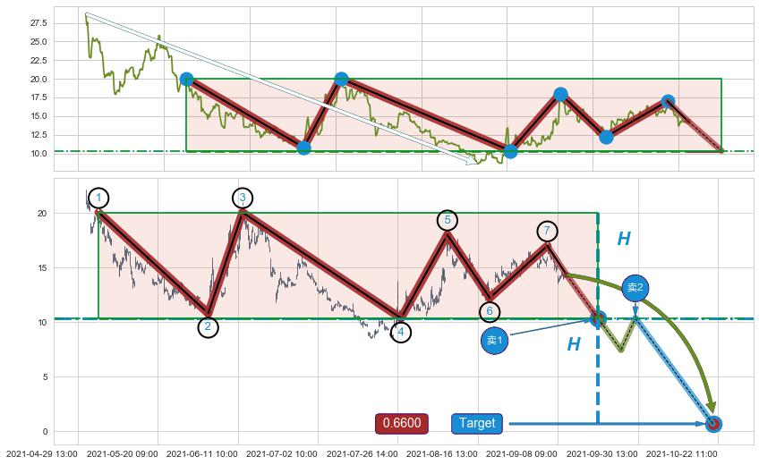 ➣ 下跌矩形整理:猜想临近关键支撑位突破点 → 临近拐点下跌 → 风险信号 → 大趋势均值回复