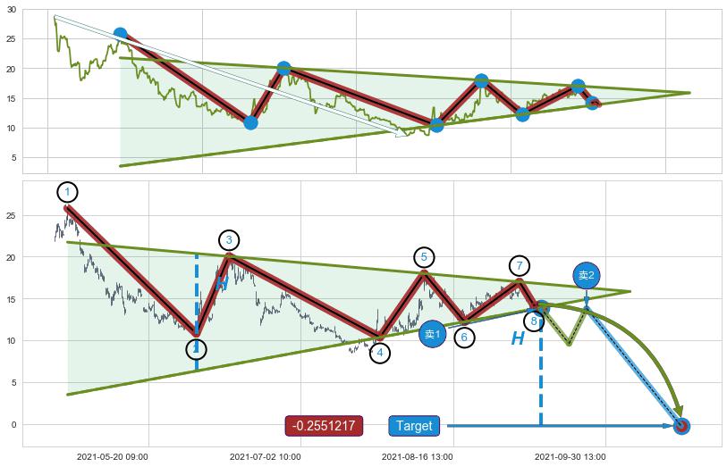 ➣ 下降对称三角整理:猜想临近关键支撑位突破点 → 临近拐点下跌 → 风险信号 → 大趋势均值回复