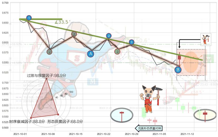 从2021-11-05 14:00至2021-11-16 10:00,共包含44个小时,阶段股价下跌-16.63%,阶段股价变动位移路程比: 1 : 3,下跌趋势角度: 33.5
