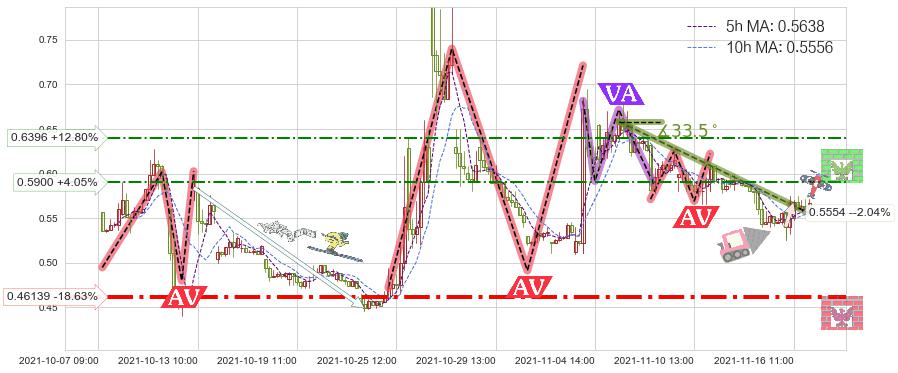 ⚔️ 2021-11-05 14:00-2021-11-16 10:00下跌趋势存在反转上涨[机会],虽然原下跌趋势的阻力位(0.5554)已被突破,但其阻力效果尚存,原下跌趋势角度: 33.5˚