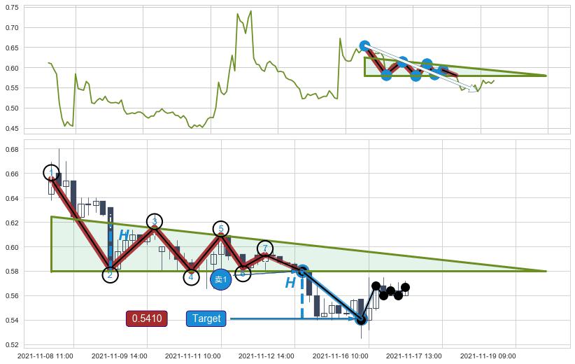 ➢ 最后的下跌趋势2021-11-05 14:00至2021-11-16 10:00:存在突破迹象,后续小反弹或者反转上涨