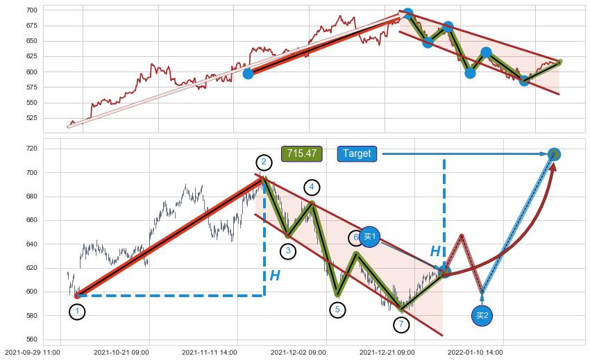 ➣ 降旗形:猜想临近关键阻力位突破点 → 临近拐点上涨 → 机会信号 → 大趋势均值回复