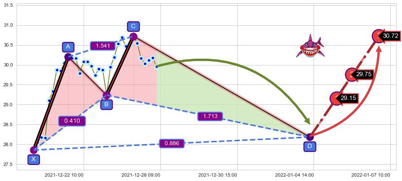 ➢ 距离预测D点位置有足够的下跌空间, 与看涨【鲨鱼】形态相反,实际方向【看跌】