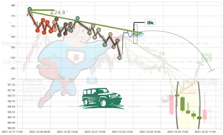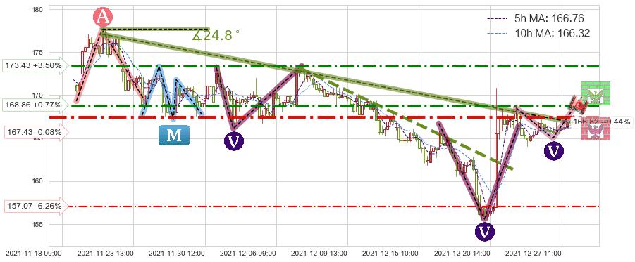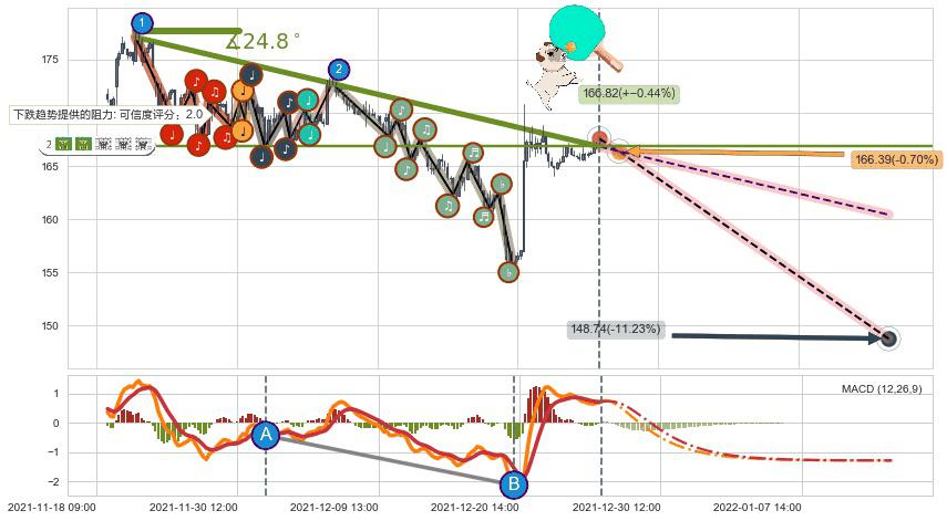 ➢ 预测:2021-12-28 14:00,【试探阻力】稳定目前下跌趋势的前提下,预测价格:166.39