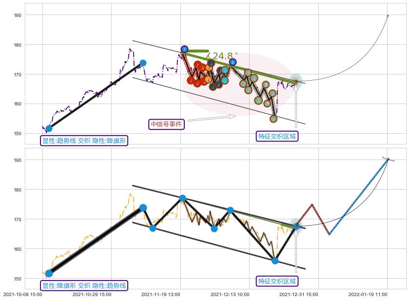 ♘ 在最后的下跌阶段2021-11-22 09:00至2021-12-21 15:00,存在 破位边缘的阻力位 ,阻力价格166.82,可信任强度64.44%,其距离最后价格167.56相差 -0.44%