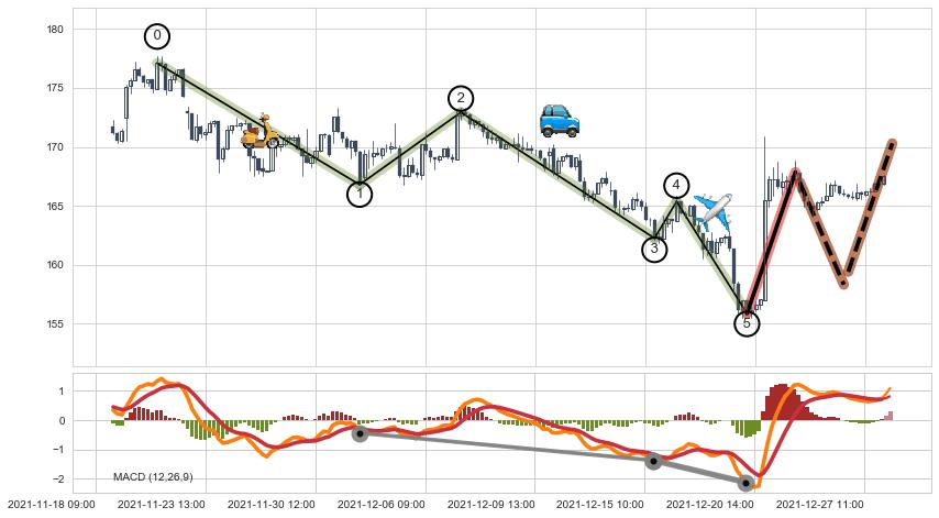 ➣ 波浪理论:临近C点,猜想击穿突破c点后继续上涨 → 上涨 → 机会信号 → 小趋势跟踪