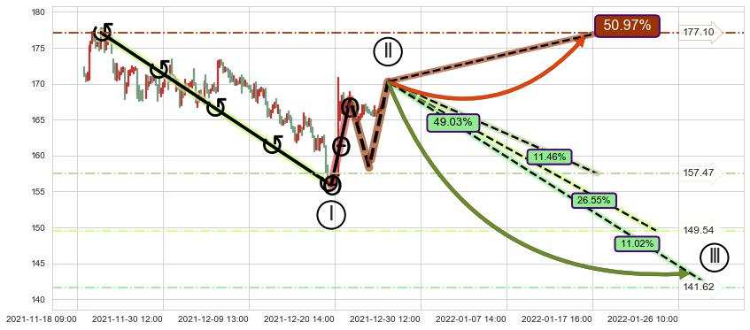 ➣ 预测:2022-01-13 14:00,【继续下探】稳定目前下跌趋势的前提下,预测价格:148.74