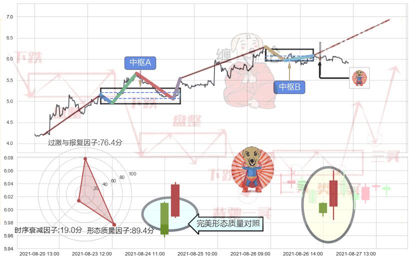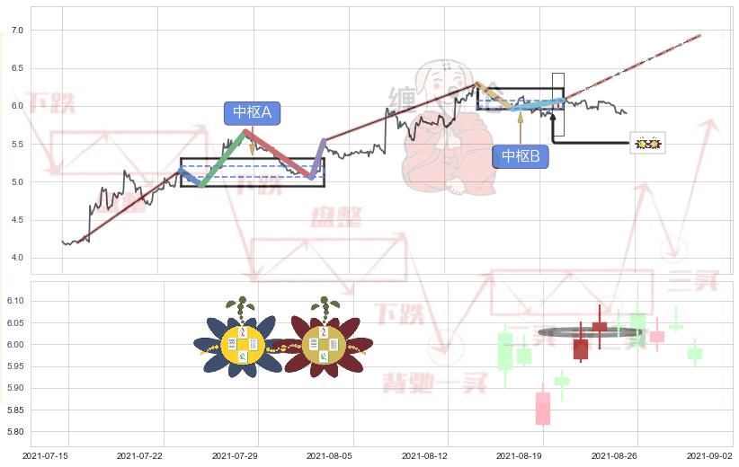 ➣ 【中枢B】:08-03:14-08-24:13,中枢由3笔构成,共90交易小时, ZG=6.08, ZD=5.96