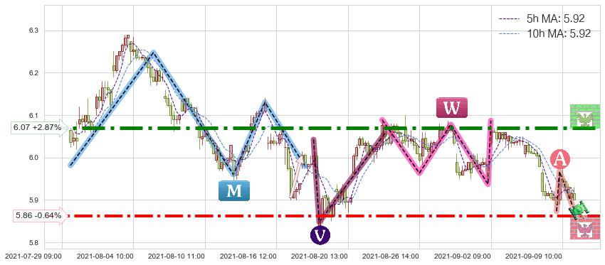 ♘ 阻力价格位6.07,可信任强度94.56%,距离最后交易2021-09-09 14:00形成的收盘价格5.90相差 +2.87%