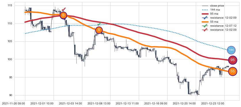 ➣ 95小时均线于(12-02 09:00: 112.14)形成【死叉】基于【死叉历史模型】预测死叉后最低波谷价格: 105.68, 死叉后最低价格90.21,已经下跌超出预测最低波谷价格, 预期反弹