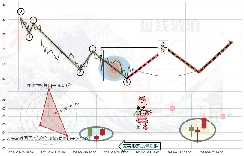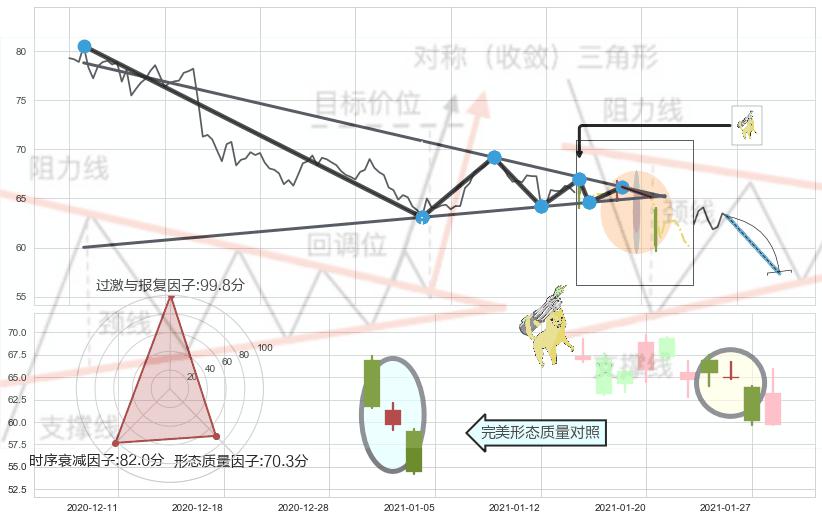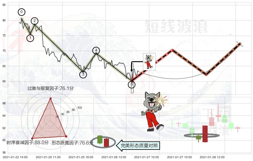 从2021-01-05 09:00至2021-01-15 16:00,共包含72个小时,阶段股价下跌-23.70%,阶段股价变动位移路程比: 1 : 3,下跌趋势角度: 57.1