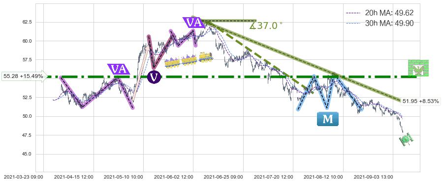 2021-07-29: 第一阻力位55.28强力阻拦了上升趋势,成功阻止了价格的继续上涨。