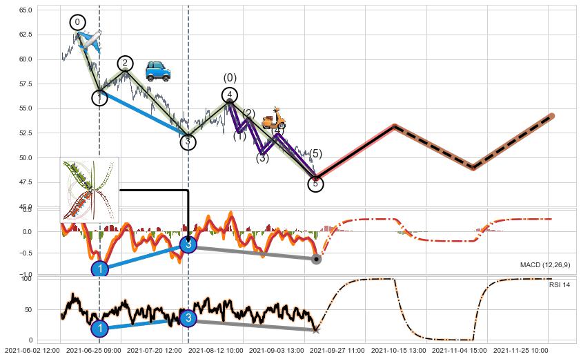➣ 第一, 三, 五浪下跌动能逐渐【衰弱变小】,趋势呈现不稳迹象
