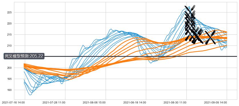 ➣ 70小时均线于(09-01 09:00: 214.20)形成【死叉】基于【死叉历史模型】预测死叉后最低波谷价格: 203.92, 死叉后最低价格207.37,尚未达到预测最低波谷价格, 预期继续下跌