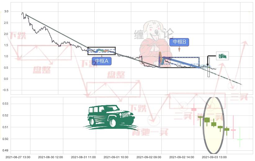 ➣ 缠论中枢点:下降缠中枢B破位后距离1买距离较远,随后猜想后续持续下跌(趋势跟踪)