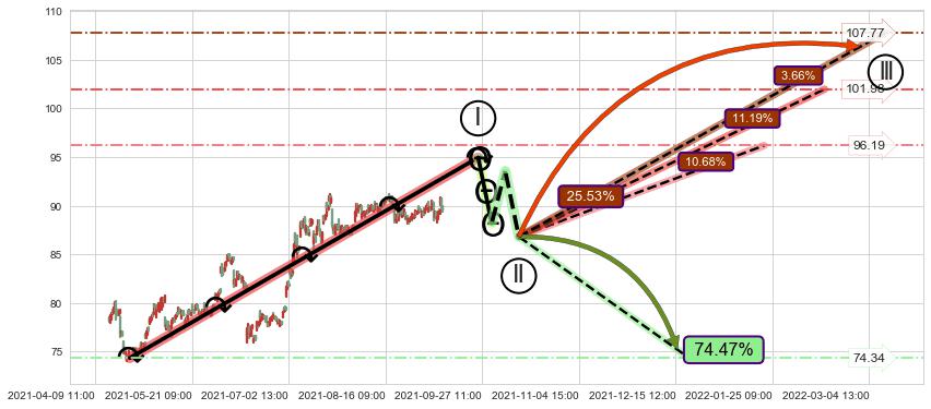 ➢ 循环浪继续向上【最高】位置(03-11:11, 107.77),匹配聚类样本比例14.33%, 可能性概率3.66%