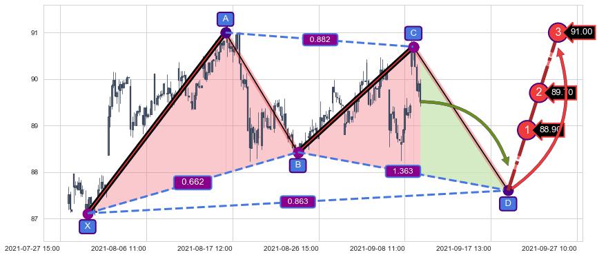 ➢ 距离预测D点位置尚有下跌空间,短线依然【看跌】, 耐心等待看涨【伽利】形态反转启动