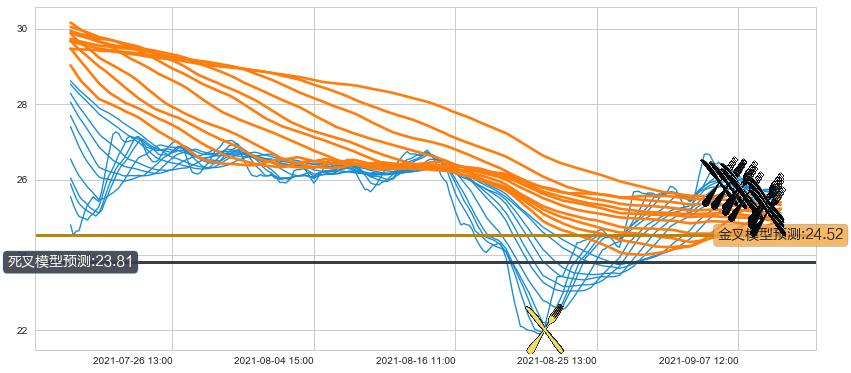 ➣ 21小时均线于(09-03 11:00: 25.92)形成【死叉】基于【死叉历史模型】预测死叉后最低波谷价格: 24.88, 死叉后最低价格24.82,虽然已经到达预测最低波谷价格,但耗时间很短动能很强, 预期继续下跌
