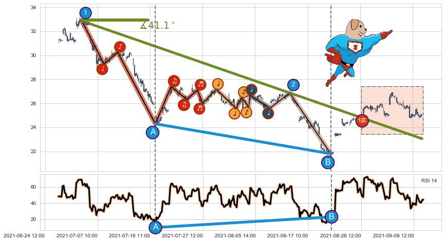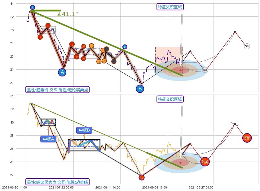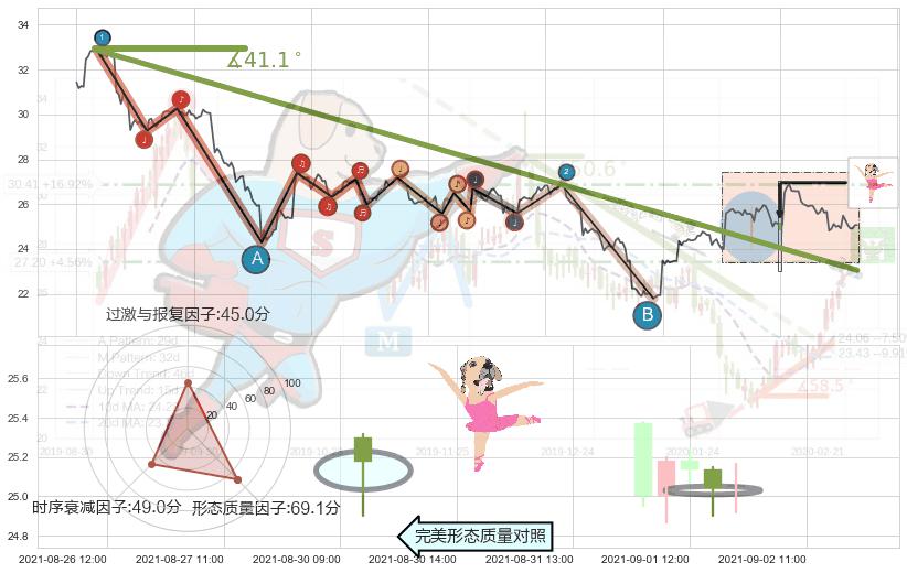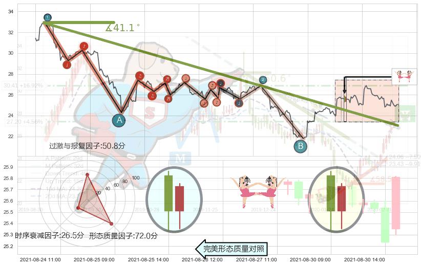 从2021-07-01 13:00至2021-08-23 15:00,共包含249个小时,阶段股价下跌-31.61%,阶段股价变动位移路程比: 1 : 6,下跌趋势角度: 41.1
