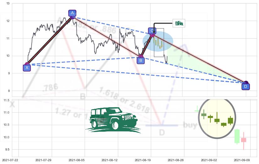 ➢ 谐波蝴蝶:b上拉接近c:猜想阻力性下沉 → 下跌 →【拐点】阻力临近 → 大趋势均值回复
