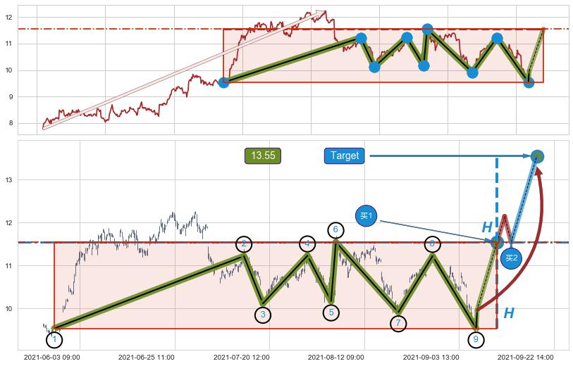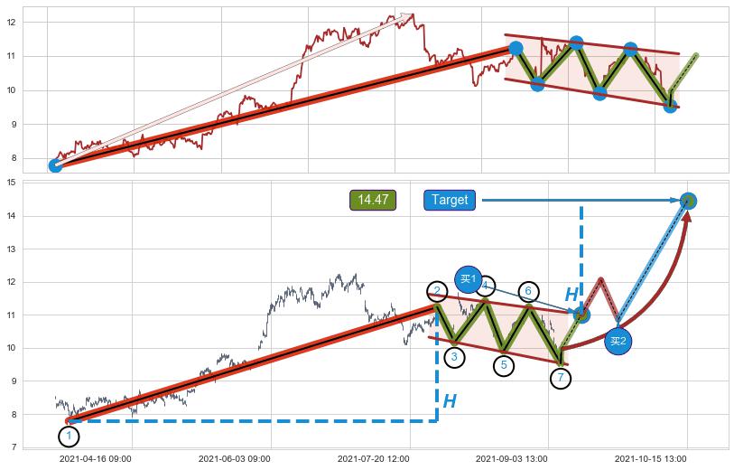 ➣ 上涨矩形整理:猜想临近关键阻力位突破点 → 临近拐点上涨 → 机会信号 → 大趋势均值回复