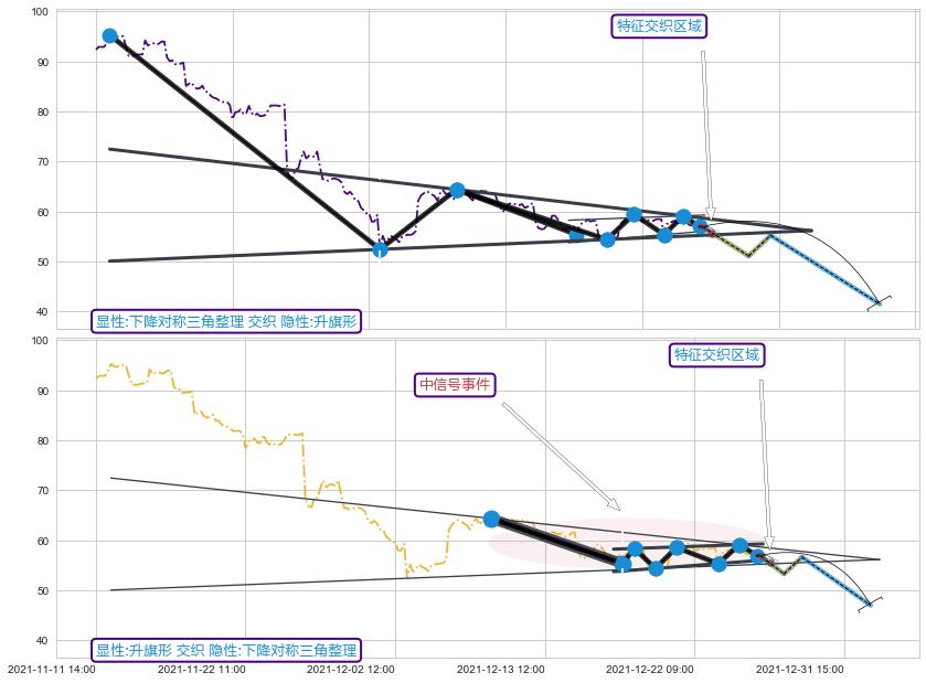 ➢ 升旗形属【中级别信号事件】下降对称三角整理属【长级别信号事件】中长周期组合信号事件,中长事件长度比41.74%