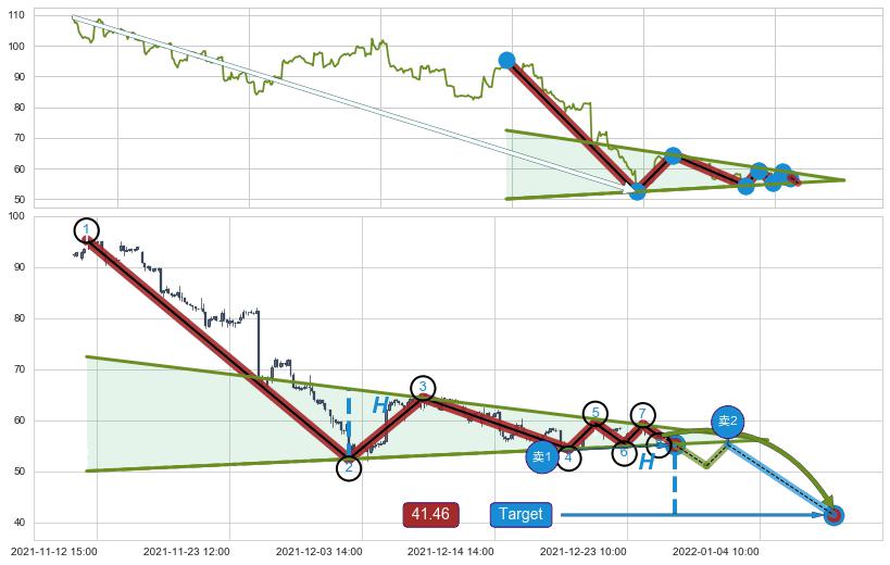 ➣ 下降对称三角整理:猜想临近关键支撑位突破点 → 临近拐点下跌 → 风险信号 → 大趋势均值回复